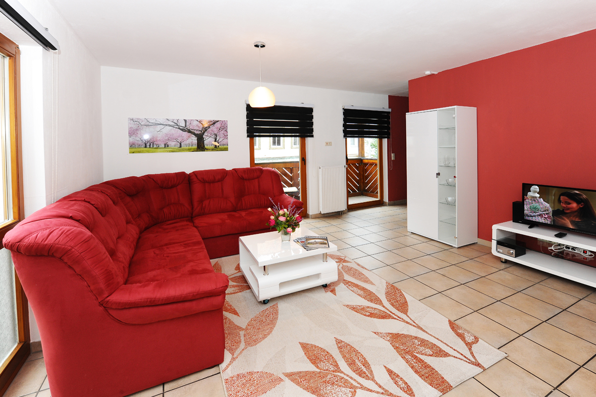 Sitzplatz mit 4 Stühlen, Eckcoach, Vitrine, Flachbild-TV,