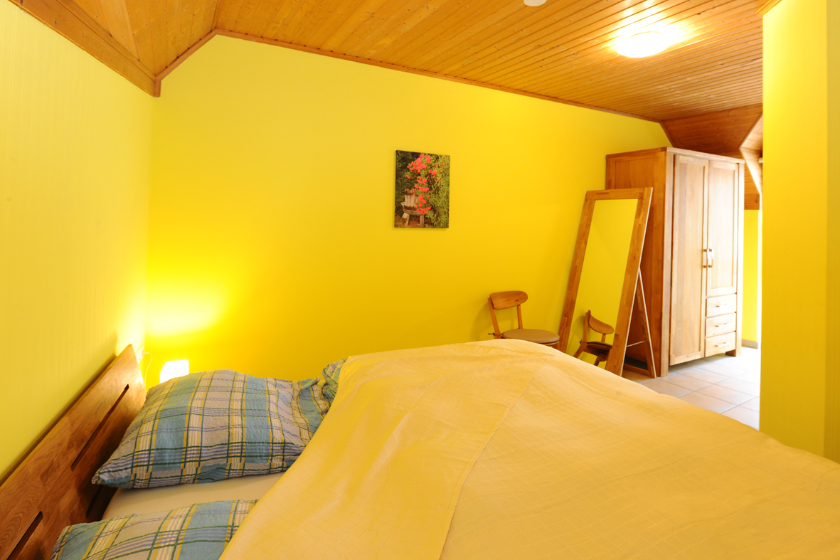 Doppelbett, Schrank, Standspiegel, Betten sind bezogen, zusätzliche Decken und Kopfkissen auf Wunsch
